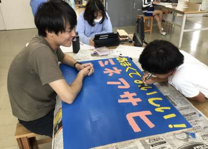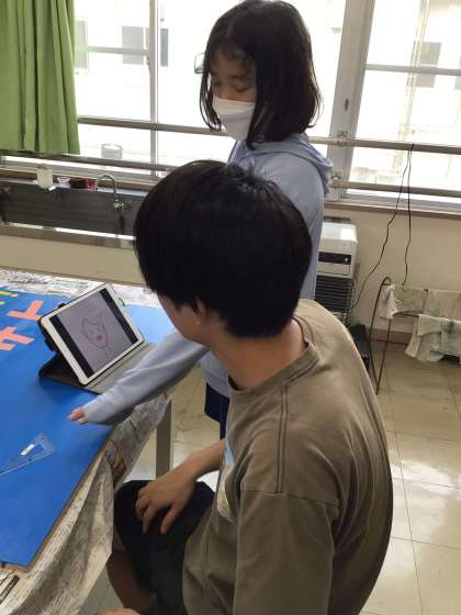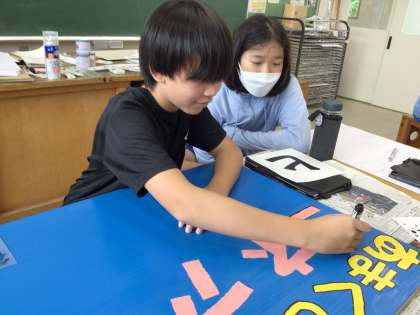 板に型を使って、字や絵を写し、ペンキを塗っていきます。