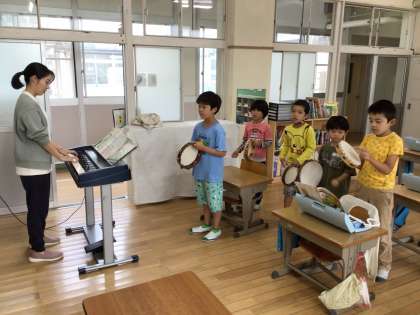 曲「いるかはざんぶらこ」などをタンバリンとカスタネットでリズムを取っていました。