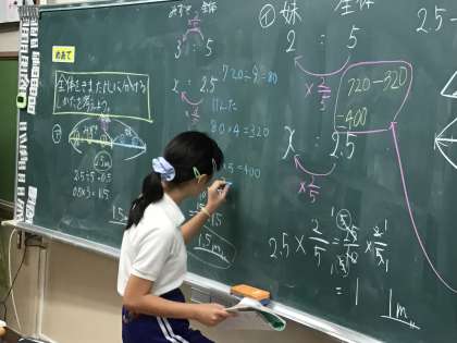 全体を決まった比に分けてそれぞれの比の部分を求める問題を解いています。