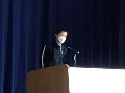 2人の子が全校の前でスピーチをしました。