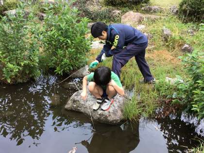 ザリガニは隠れているので網でとることも大変ですが、手作りの釣竿でつるのはもっと難しいです。