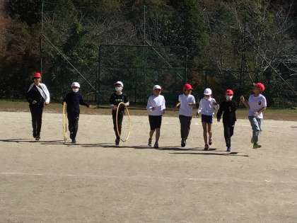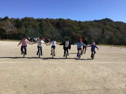本部席まで学年ごと手をつないで一輪車をこぎます。