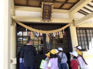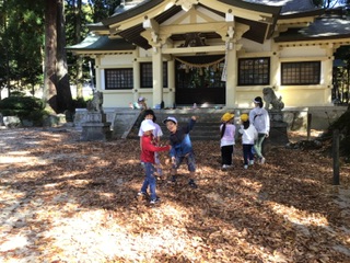 秋晴れの中、町探検に行ってきました。今回は、御作公民館と八柱神社です。棒の手で馴染みのある子もいれば、初めて入る子も。区長さんにたくさん説明してもらいながら、勉強しました。