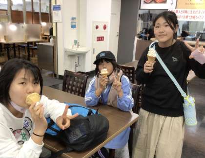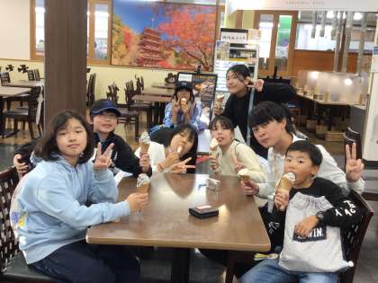 針テラスで、記念にみんなでソフトクリームを食べました。