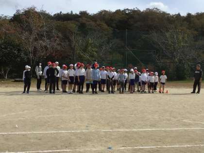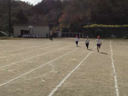 50m走です。運動場の真ん中を元気よく走り切ります。