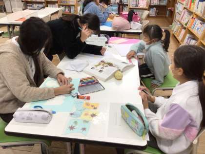 長方形ではなく、いろいろな形をしたしおりに葉っぱをつけるなど、工夫がたくさんありました。