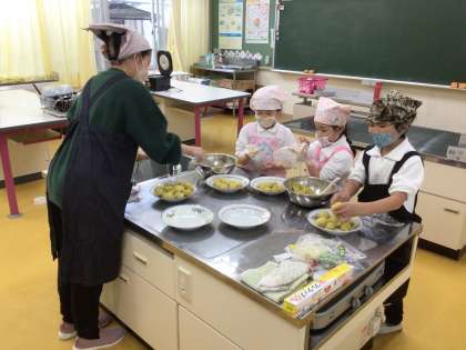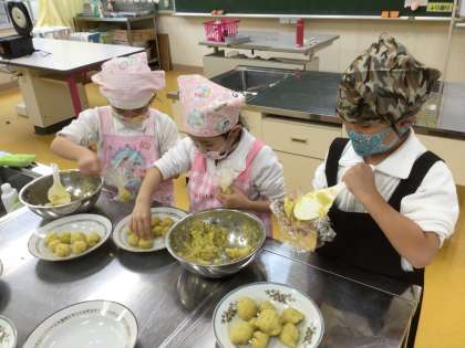 生活科の授業で育てた大きな大きなさつまいもを蒸して、茶巾絞りにしました。