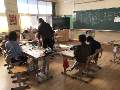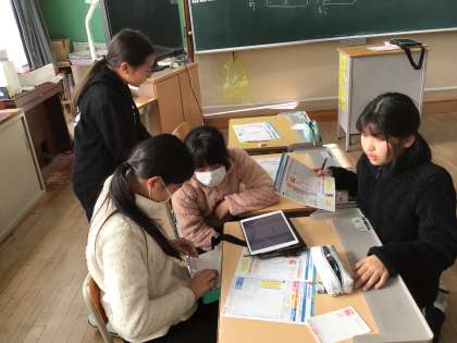 ポルトガル語で友達に年賀状を書くために、みんなでタブレットでポルトガル語を調べ始めました。