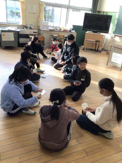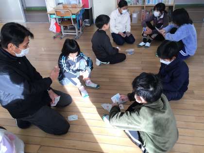 英語で「〜持ってる?」と聞かれて、そのカードを持っていると出していくというゲームをやっています。楽しく英単語を学ぶことができます。