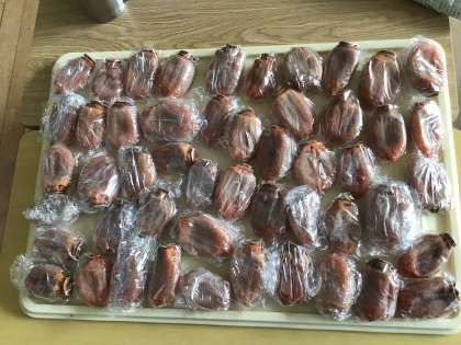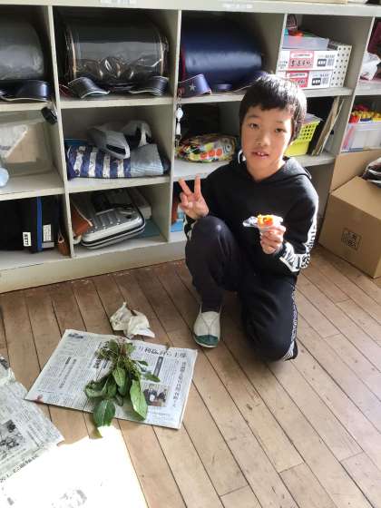 干し柿は全部ラップに包み終わりました。その後、3・4年生の子たちは干し柿を食べました。干し柿を食べたことがない子もいて、少しずつ食べて味を確認している子もいました。おいしかったようです。