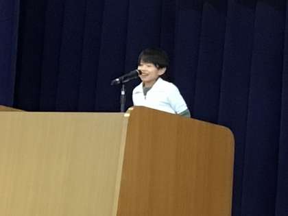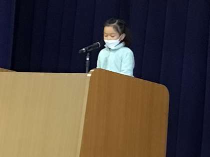 7人の子たちが全校集会でスピーチを堂々と行っています。