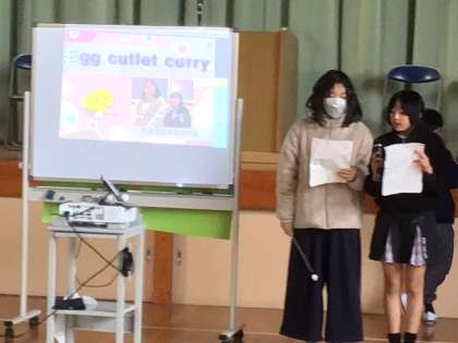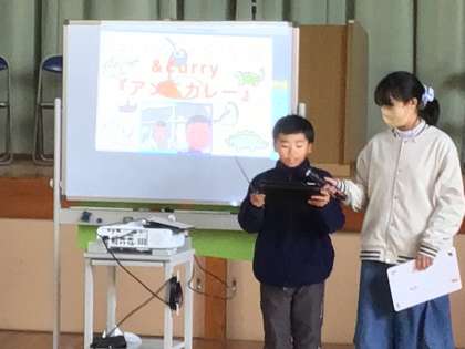 タブレットで、自分たちの考えたカレーについて、発表しています。