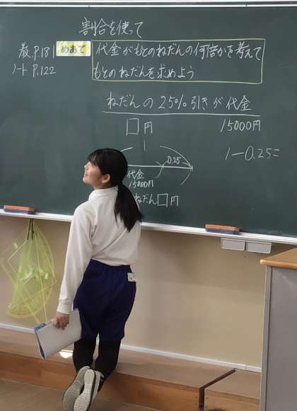今日は割合でも「もとになる数」を求める問題でした。また、25%引きの値段の割合をひき算で求めないといけないことやわり算で求めるということに気付くことが難しかったようです。