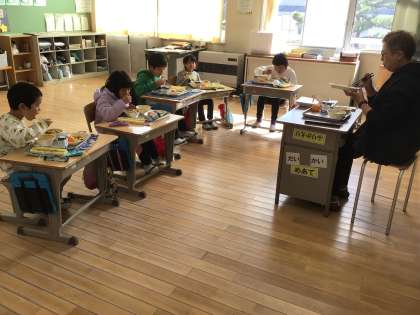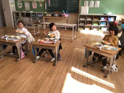 給食がみんなの大好きなカレーライスでした。みかんもつきました。イカの入ったサラダもありました。冬のあたたかいスープはありがたいです。おいしいという顔で給食を食べています。