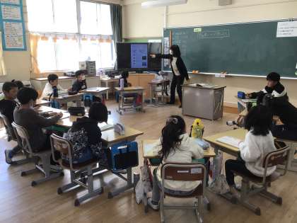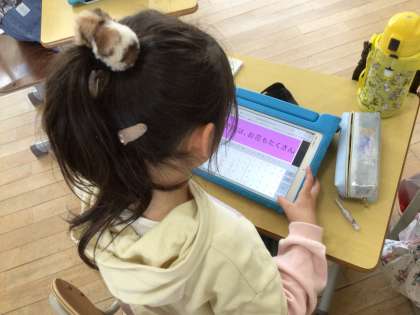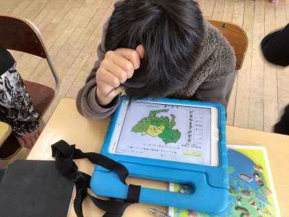 愛知県の産業や工業について、副読本「豊田」の資料を見ながら分かったことや気付いたことをタブレットのワークシートにまとめていました。