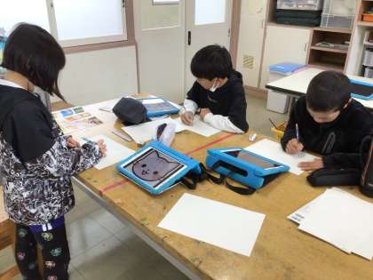 何を描くかをタブレットで検索し、参考にして下絵を描いている子もいますし、画用紙に絵を描き、色付けをしている子もいます。