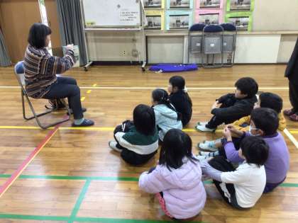 体育館で集まって、読み聞かせと感謝の会を行いました。