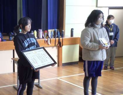 健康いきいき委員会の委員長と副委員長に代表で賞状と盾を受け取ってもらいました。