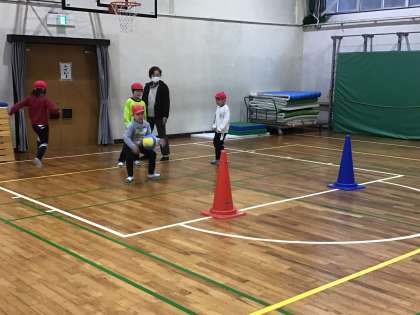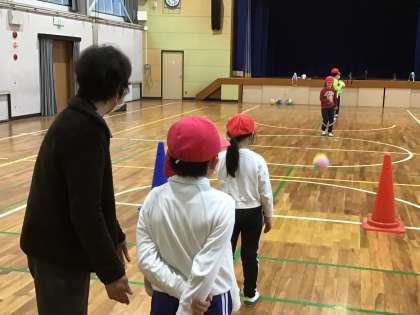 2手に分かれて、一方はコーンとコーンの間にボールを蹴り、もう一方はそのボールを受け取るということを楽しく行なっていました。