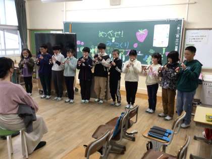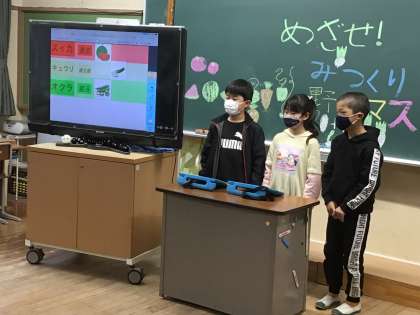 3・4年生は、リコーダー演奏から「めざせ みつくり野菜マスター」の発表へと移行していきました。「めざせ みつくり野菜マスター」の発表は、大きくは3つのグループに分かれて発表していますが、一人一人の注目点は違うので、一人一人がタブレットを使って、1年間追究してきたことを発表しました。