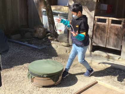 紙すき、藍染、竹とんぼ、機織り、こまの体験場所に別れて向かいました。
