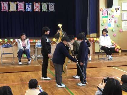 6年生の代表が5年生の代表に校旗を手渡しました。