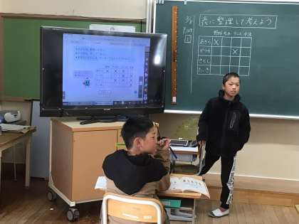 4人の子たちが違うスポーツなのですが、「あきらは野球ではない」などの条件で表に◯、×をつけて正解を導いています。