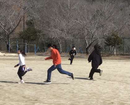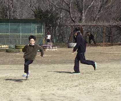 次は、1年生から5年生までの子たちと6年生・先生2人のチーム対決鬼ごっこです。