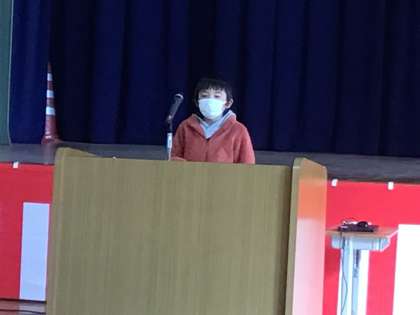 1年生の子と2年生の子がスピーチしているところの写真です。