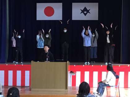 5年生の子は委員会で頑張ったことを話しました。昼の放送で生歌を披露していたのですがこの日も「唱」を披露しました。壇上では、歌に合わせてダンスが披露されました。