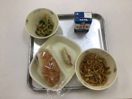 今日の給食は、こめっこぱんに焼きそば、餃子、おしたしです。