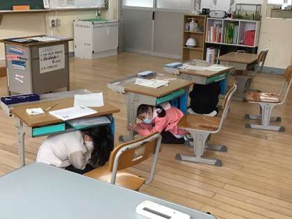 1・2年生の子たちは、教科書等を頭の上に置き、落ち着いて、運動場に避難しました。