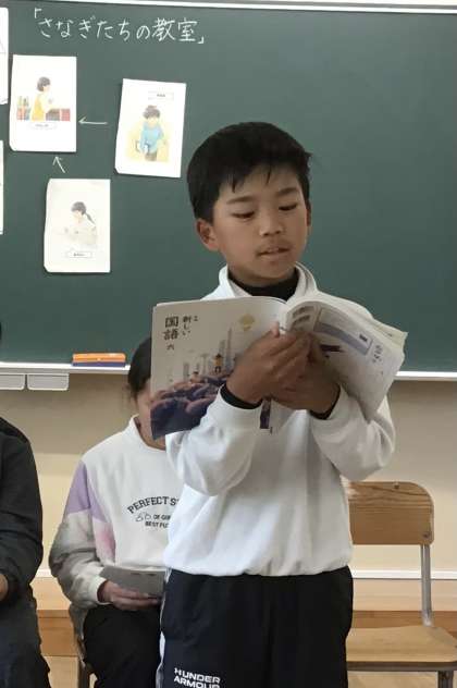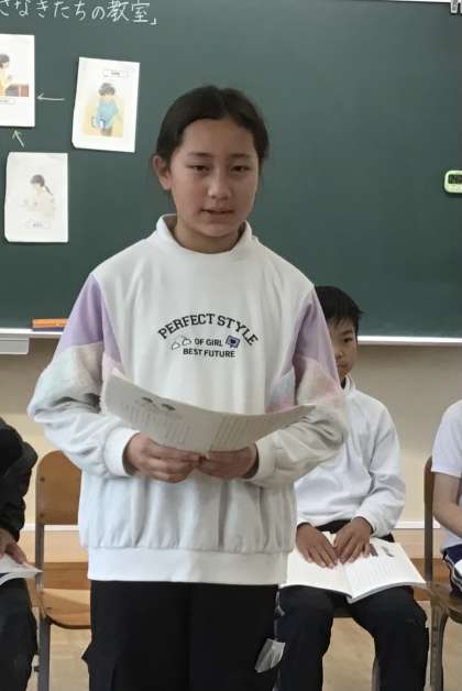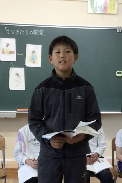 朗読する前に、「さなぎたちの教室」のどこの部分を朗読するか、そして、どのように朗読するか、どのような工夫をするかをメモを見ることなく話してから朗読をしました。