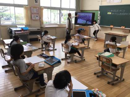 教室に戻って、藤の写真を大型テレビに映して、藤の花はどんな花か感想等を言ってから、絵を描き始めました。