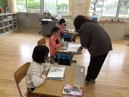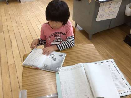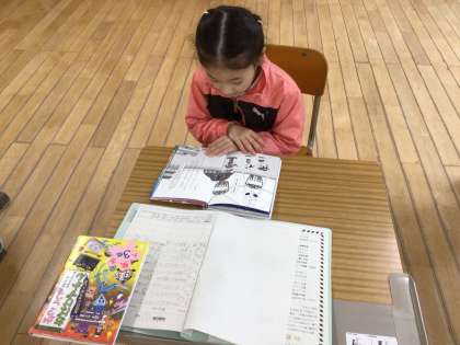 担任の先生が、3・4年生の図画工作科の作品について3・4年生の子たちに説明に行っている間、自分たちで読書をして待っていました。
