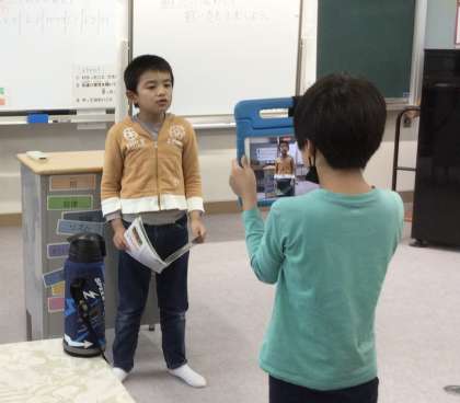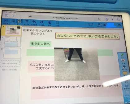 自分で歌う曲を決め、「どんな歌い方をしたいか、工夫したいこと」も考えて、みんなの前で歌います。歌っているところを友達に撮影してもらい、タブレットのワークシートに記録として残しました。