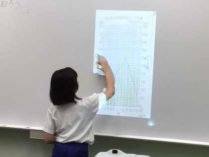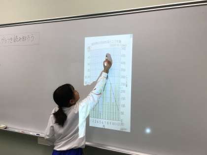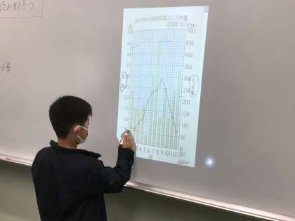 1つのグラフに折れ線グラフと棒グラフがあるものから、問われたことに答えています。