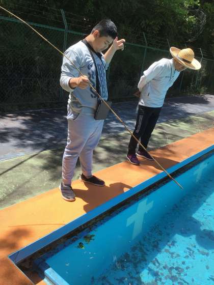 プールにも立ち寄り、プールの水が案外きれいだということに気づいたり、ゲンゴロウやトカゲなど生き物を探したりしていました。タブレットで、見つけたものを撮影していました。