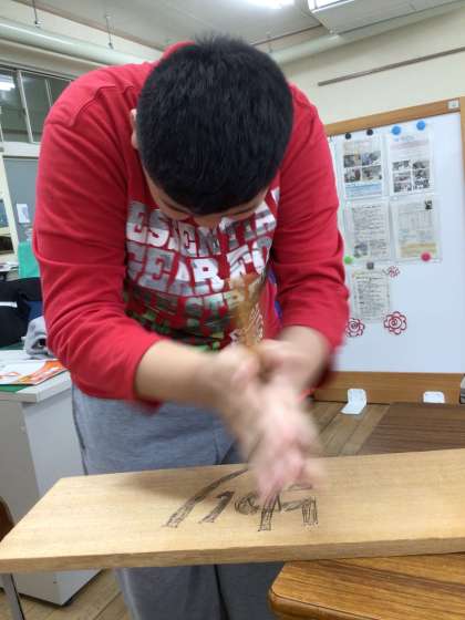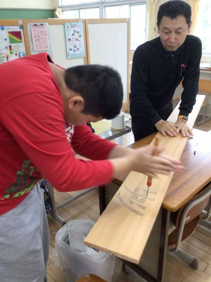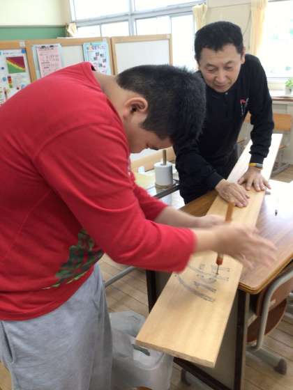 糸鋸で切る準備段階として、「ゆり」の字の角に穴を開けているところです。