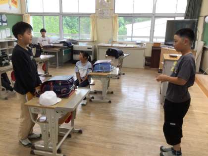 5・6年生は、「今日の授業について」日直さんが語っていました。それに対して、友達が「自分はこうだったよ」なんていう感想を言っていました。係りからの連絡を言っている子もいました。