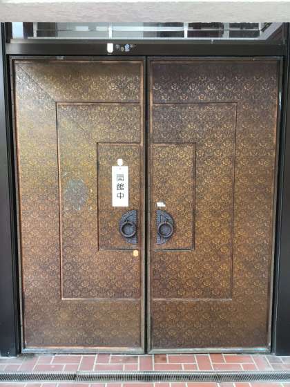 御作公民館の入口や部屋のドアは重厚感があります。ステンドグラスもステキです。