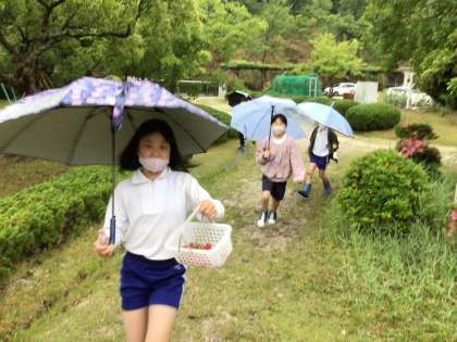 雨の中、子どもたちがイチゴの収穫に行きました。