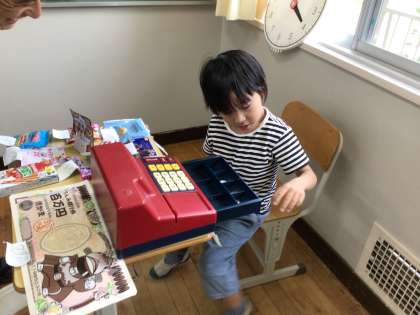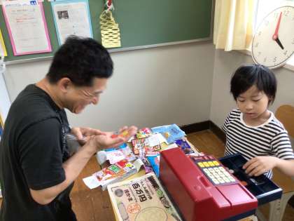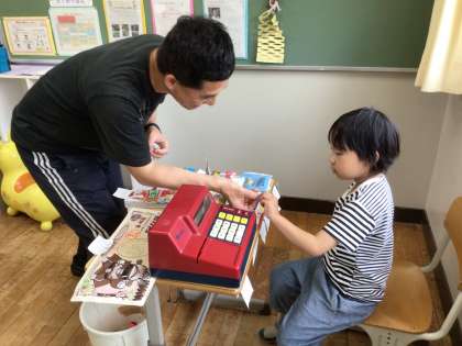 担任がお客として買い物をして、子どもがお店の方として対応をしています。