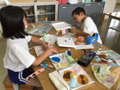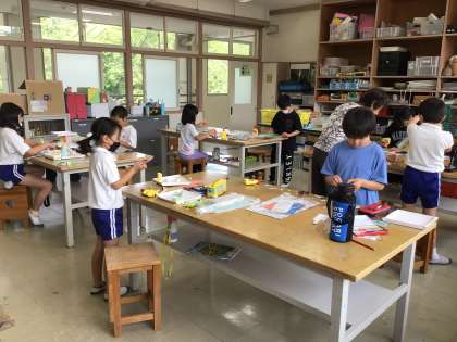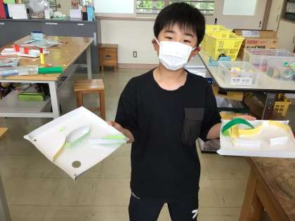 4枚のお皿にいろいろな世界を創造しながら、ビー玉が転がる道を考えて作っています。