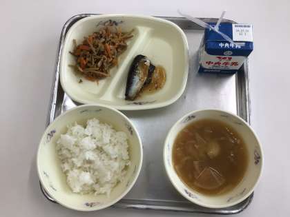 1年生の保護者の方には、4時間目の食の指導の授業を見ていただき、そのまま給食の配膳の様子も見ていただきました。今日の給食は、きんぴらごぼうとイワシの梅煮、玄米だんご汁、ご飯、牛乳でした。とても慎重にお汁を運ぶかわいい姿などを見ていただけたと思います。