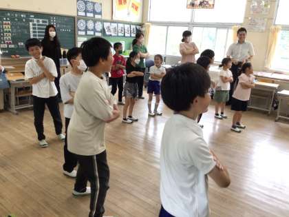 5年生教室のグループは英語のダンス映像を見てみんなで楽しくダンスしました。その後、動物からアルファベットになる映像を見ながら、アルファベットを声を出して当てていきました。映像がおもしろくて画面を集中して見ていました。