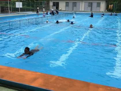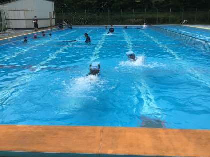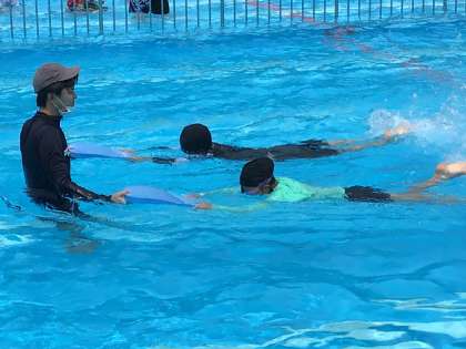 ビート板なしで泳いでいるグループとビート板ありで泳いでいるグループがあります。