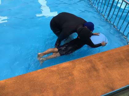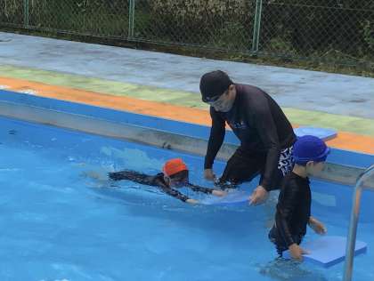 ビート板を使ってみずのうえをスイスイ泳ぐイメージをつかみました。
