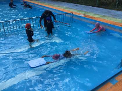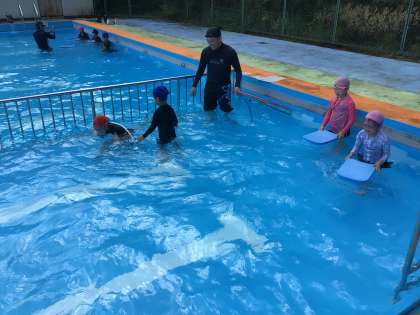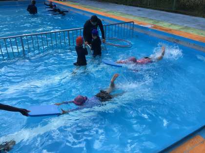 1、2年生の子たちで、輪くぐりやビート板を持ってバタ足をしているところです。