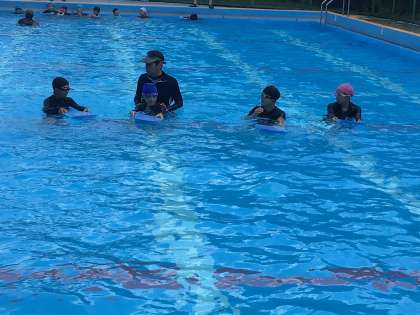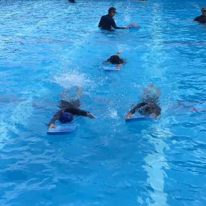クロールの手の確認をしてから、ビート板を持って泳ぎ出しました。